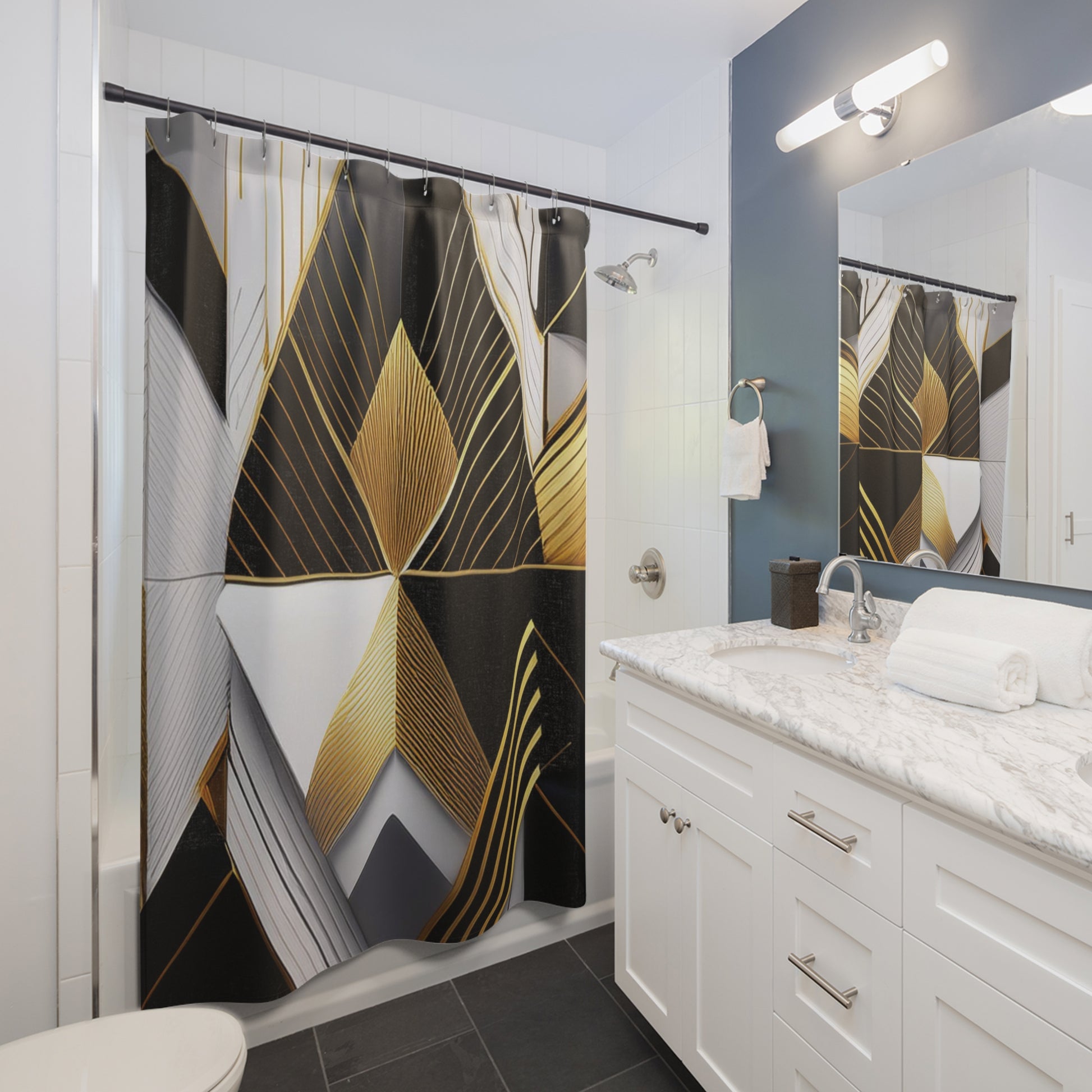 Introducing our elegant Black, Gold, and White Abstract Shower Curtain, designed to add a sophisticated touch to any bathroom. The striking combination of bold black, luxurious gold, and crisp white creates an artistic statement that complements modern décor. Made from highly durable polyester, this shower curtain is built to last and maintain its vibrant look for years. The smooth fabric is perfect for showcasing this unique design, transforming your bathroom into a chic, stylish space.