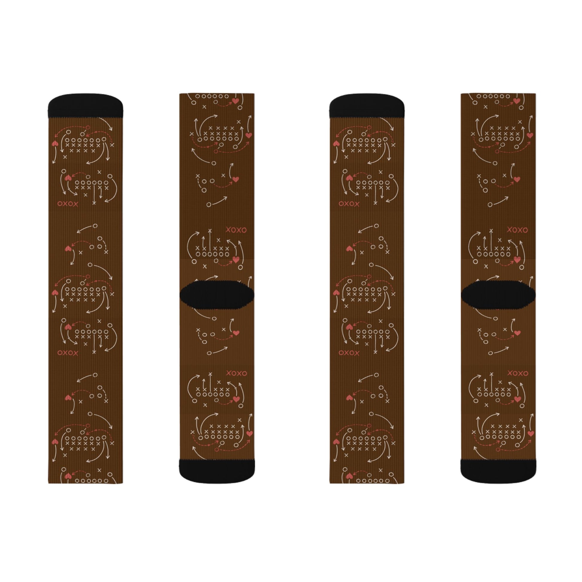 Call the shots in comfort and style with our Football Playbook socks. Featuring a bold sublimated design inspired by classic play diagrams, these socks bring a smart, athletic edge to any outfit—perfect as a subtle accent for everyday wear or a standout piece for game-day looks.