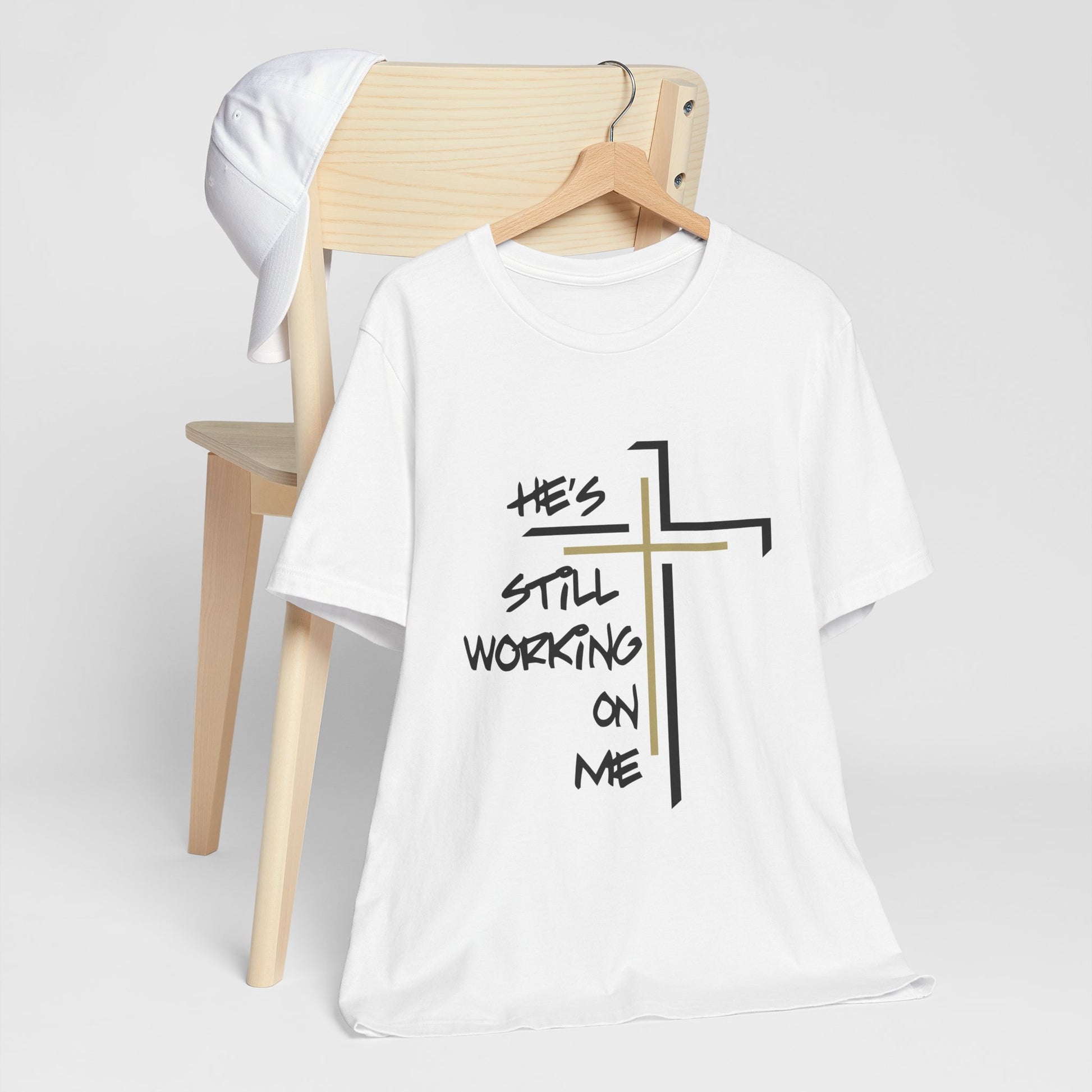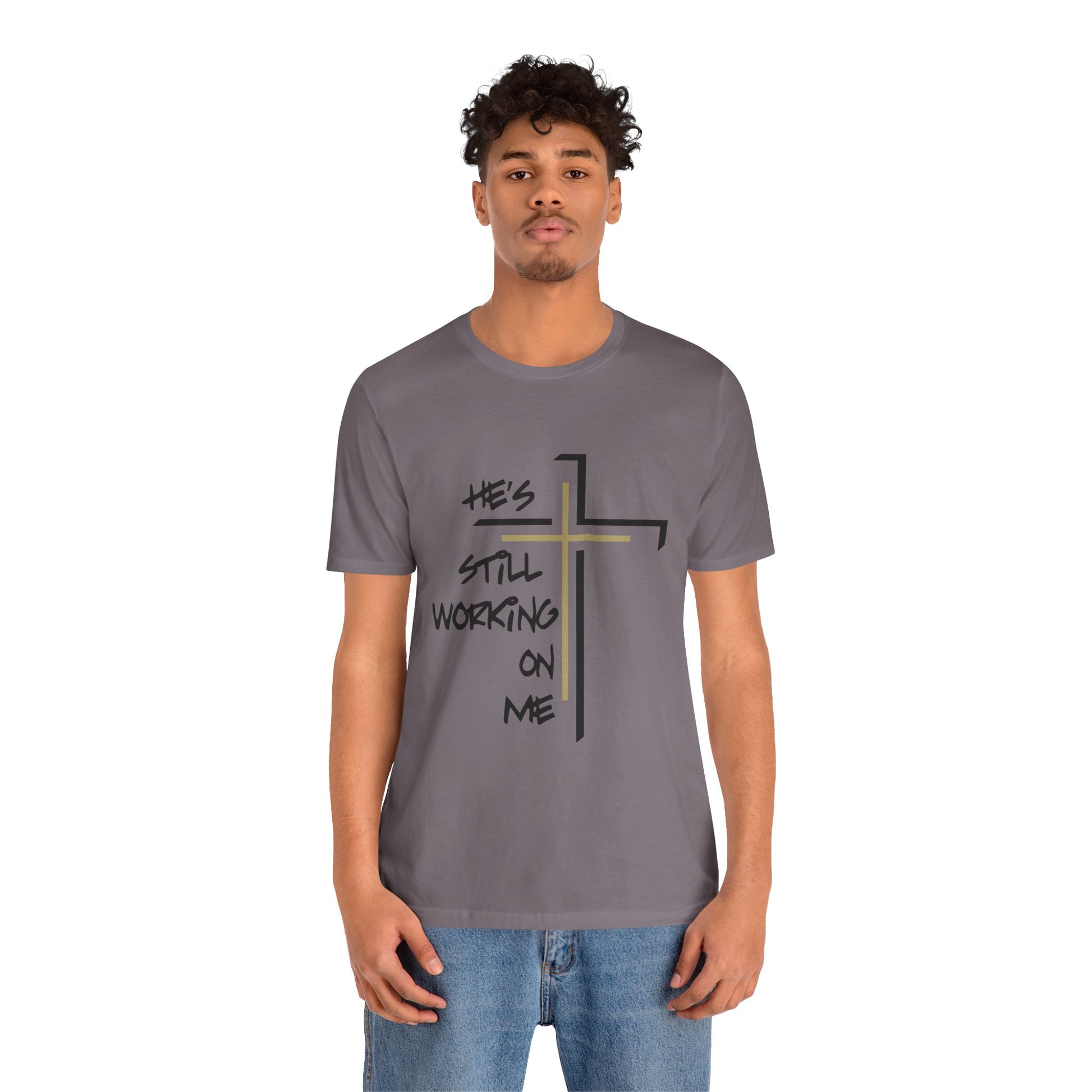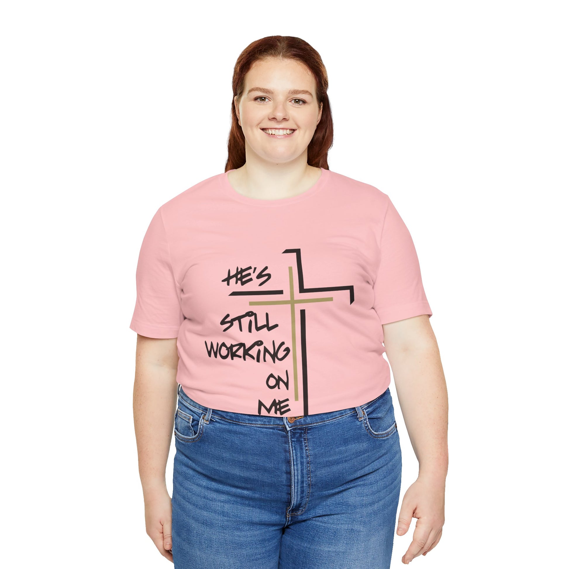 Embrace your journey with the "He's Still Working On Me" t-shirt, a perfect expression of growth, faith, and self-improvement. This classic unisex jersey short sleeve tee is designed to fit like a well-loved favorite from the moment you put it on. Made from soft cotton and featuring a high-quality print, it’s a shirt you'll fall in love with time and time again.