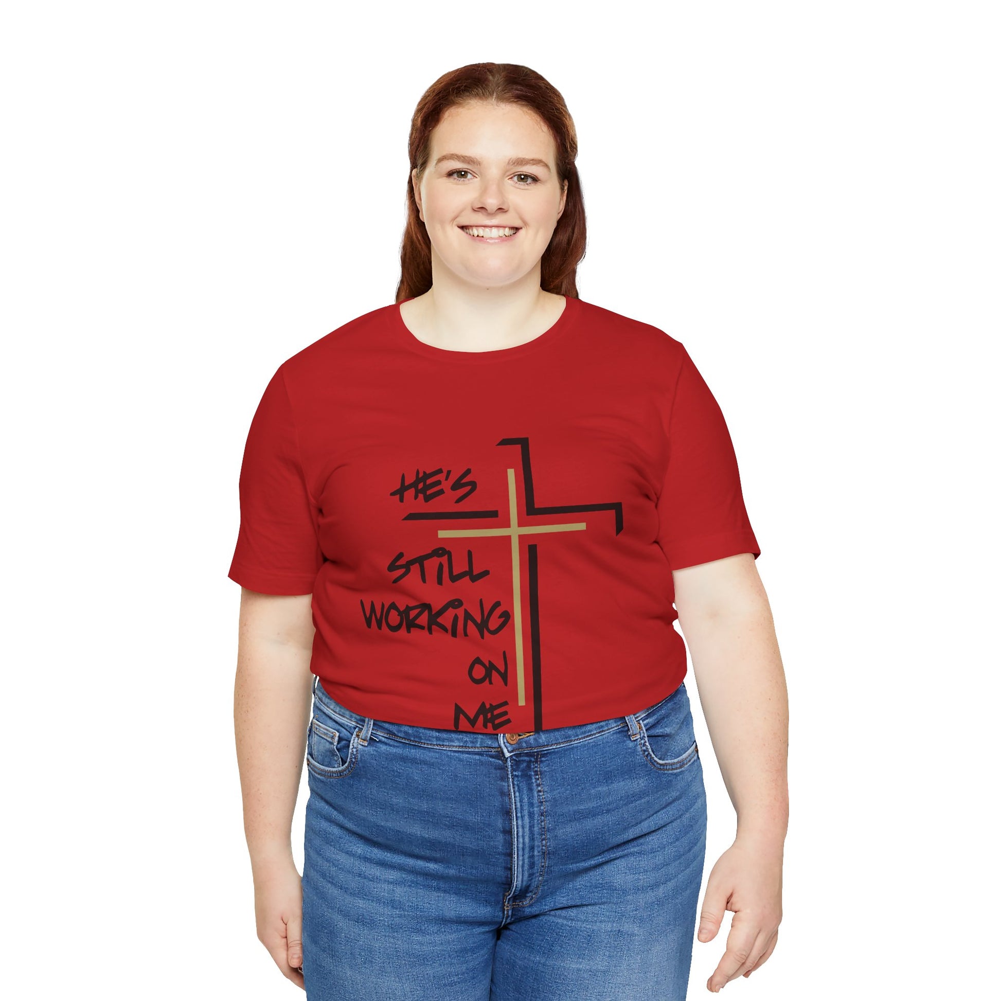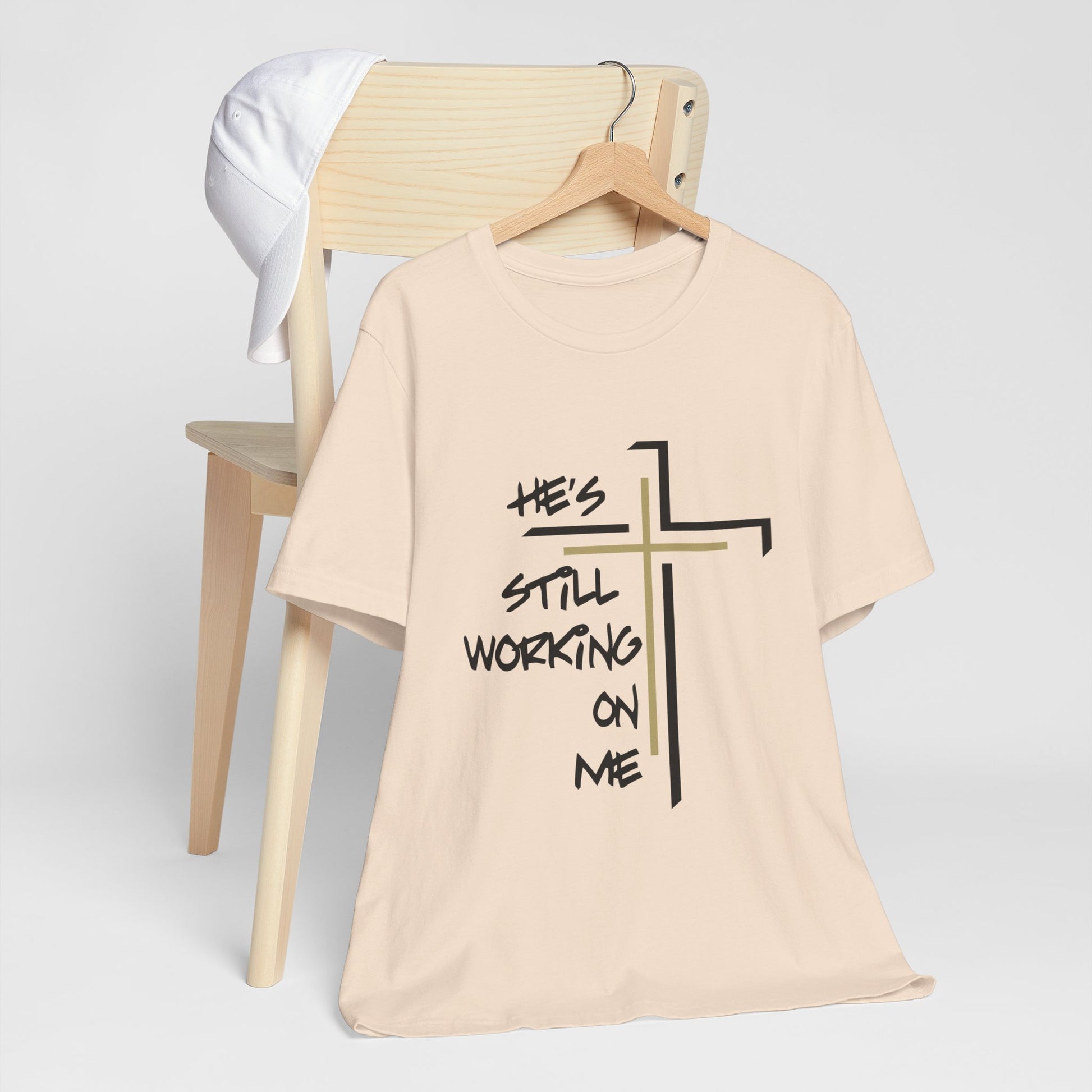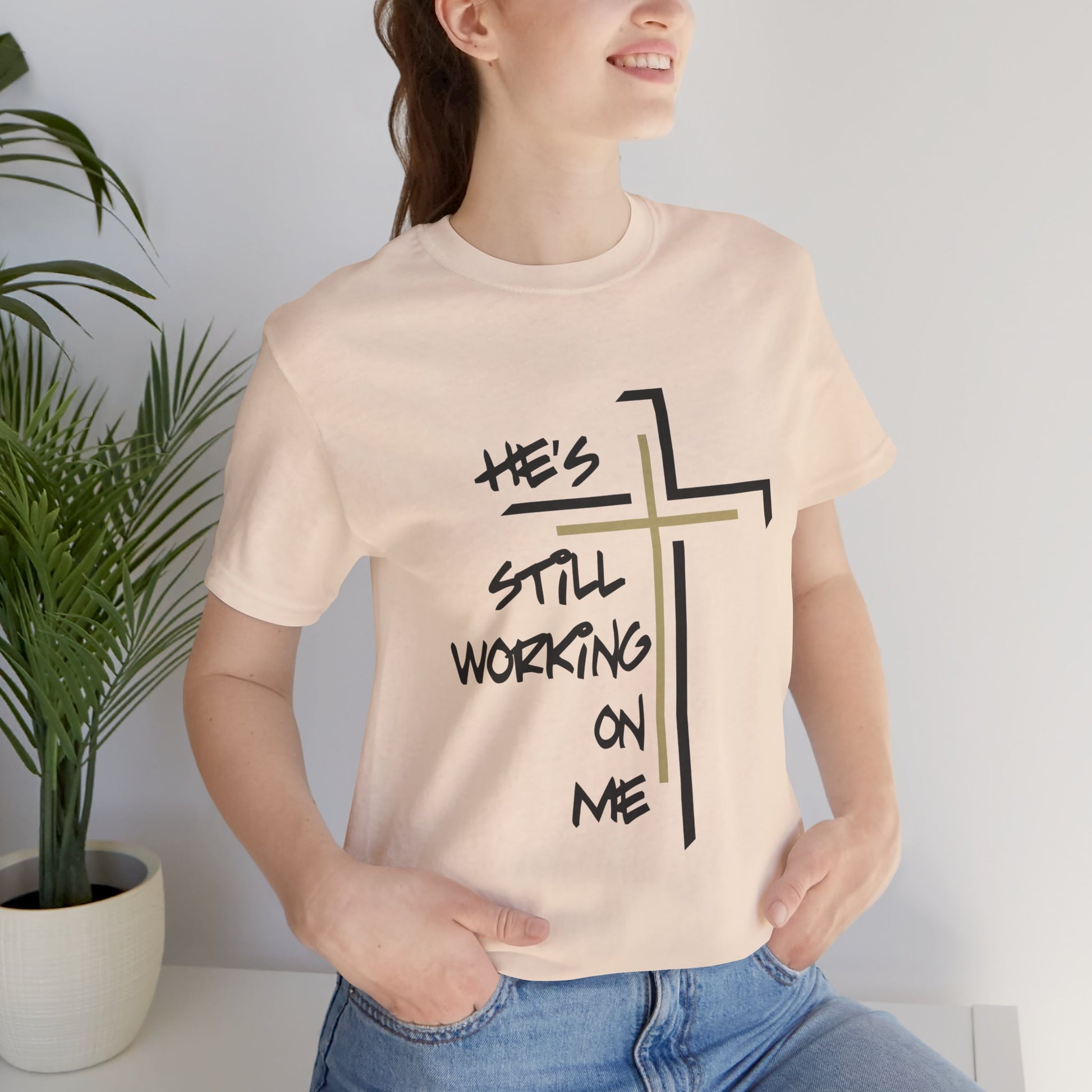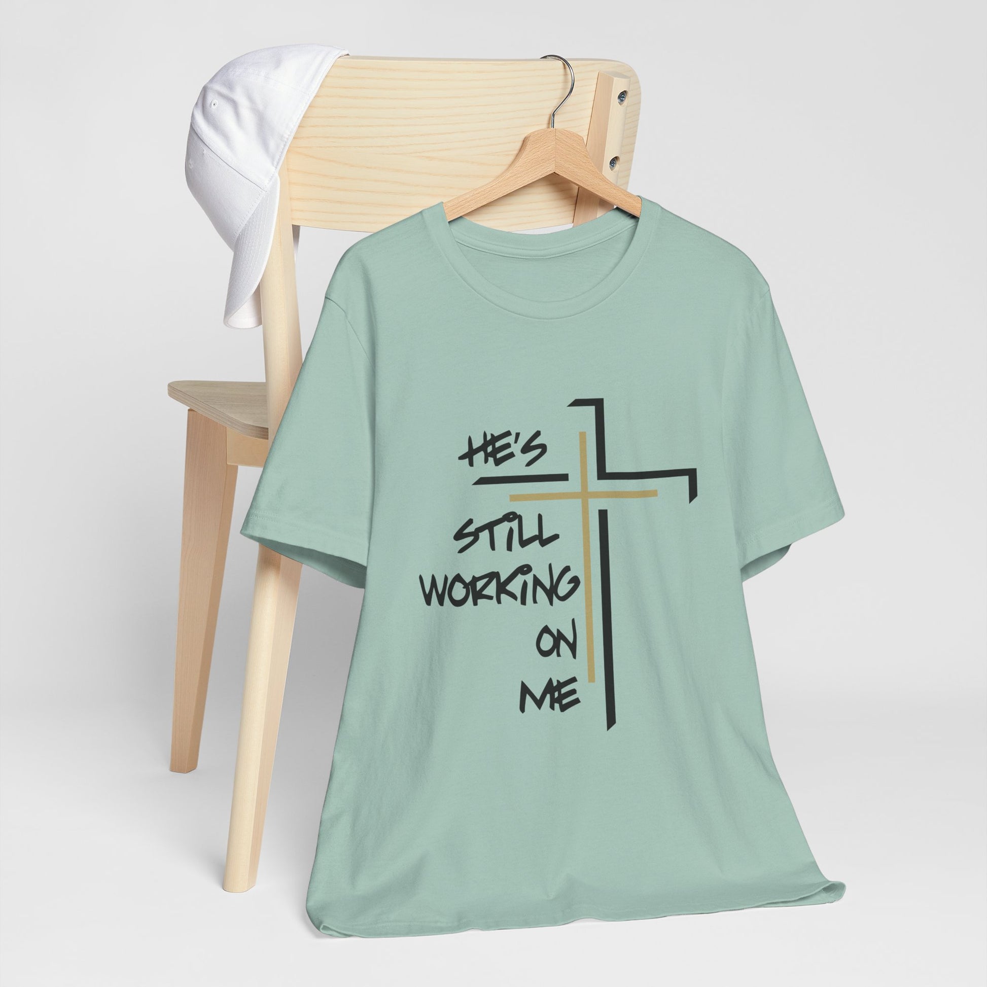 Embrace your journey with the "He's Still Working On Me" t-shirt, a perfect expression of growth, faith, and self-improvement. This classic unisex jersey short sleeve tee is designed to fit like a well-loved favorite from the moment you put it on. Made from soft cotton and featuring a high-quality print, it’s a shirt you'll fall in love with time and time again.
