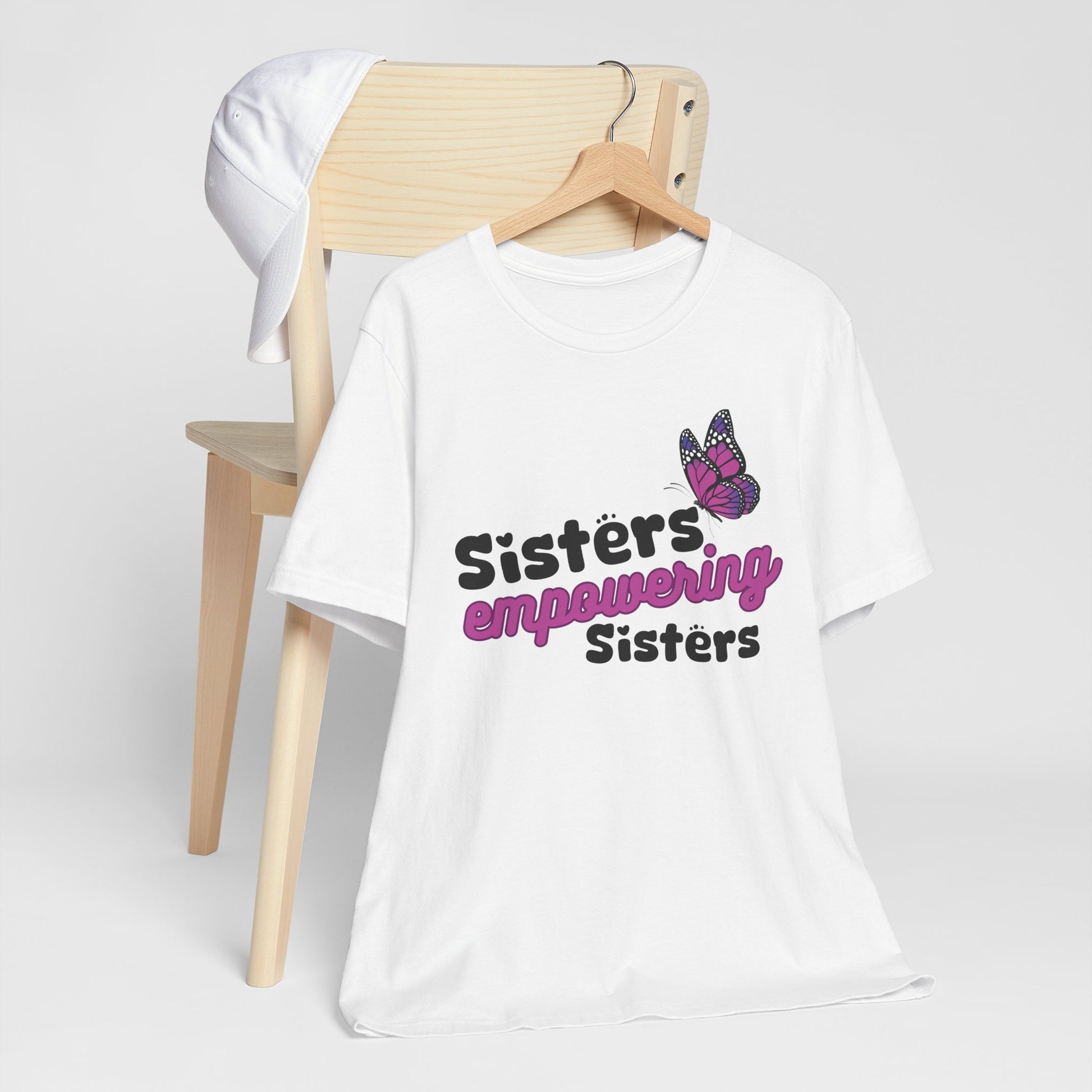 This classic unisex jersey short sleeve tee fits like a well-loved favorite and is crafted from soft, breathable cotton for unmatched comfort. Featuring a vibrant, high-quality "Sisters Empowering Sisters" butterfly design printed on the front, this tee makes a statement of sisterhood, resilience, and power.